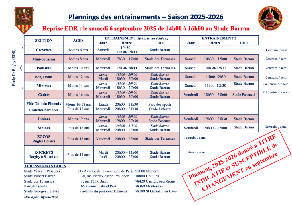 Les entraînements ont lieu le mardi et jeudi de 20h à 22h au Stade des terrasses à Carrières sur Seine.